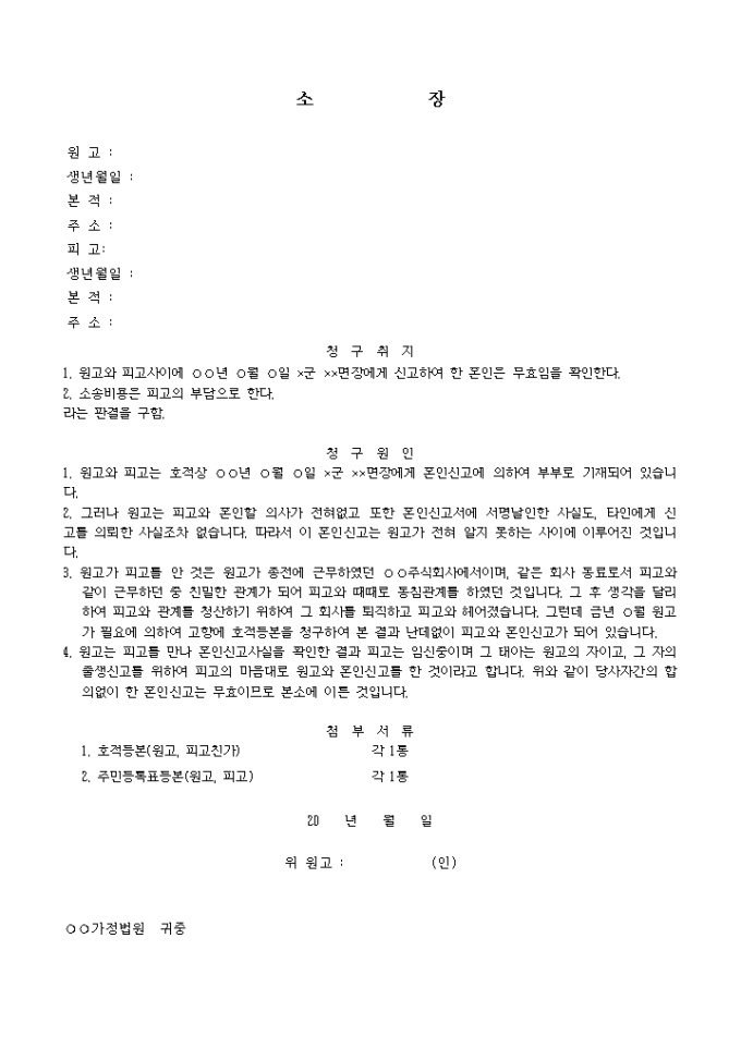 (당사자의 일방이 신고한 경우)원고와 피고사 이에 면장에게 신고하여 한 혼인은 무효임을 확인요청할 때 사용하는 소장 양식입니다.