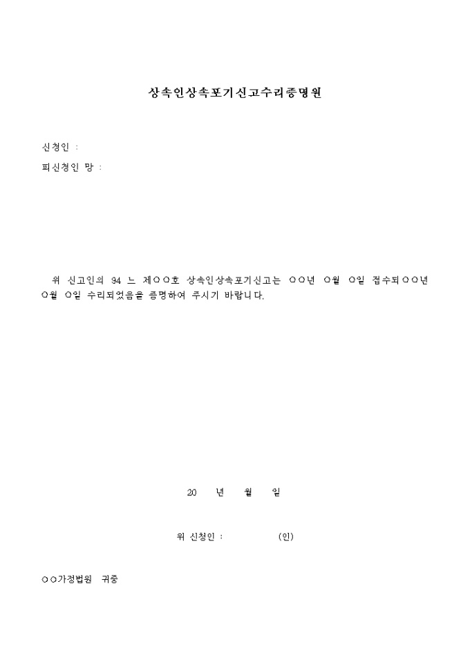 9,000원/월상속인상속포기신고는 기재일에 접수되어 특정일에 수리되었음을 증명할 때 사용하는 양식입니다.