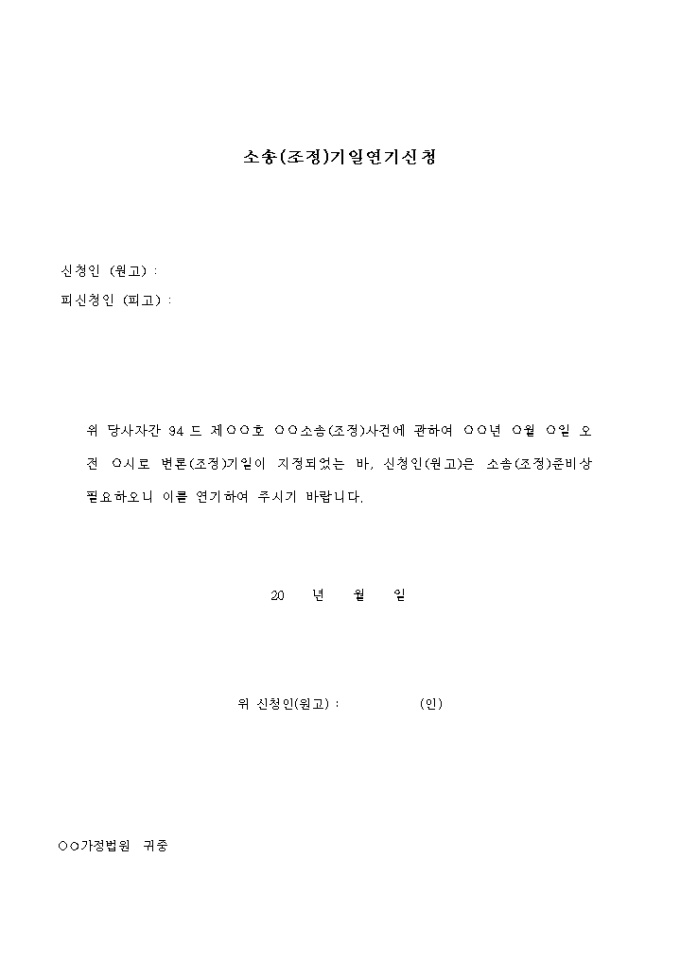 9,000원/월소송(조정)사건에 관하여 변론(조정)기일이 지정되었는 바, 신청인(원고)은 소송(조정)준비상 필요하오니 이를 연기하여 주기를 요청할 경우 사용하는 신청서 양식입니다.
