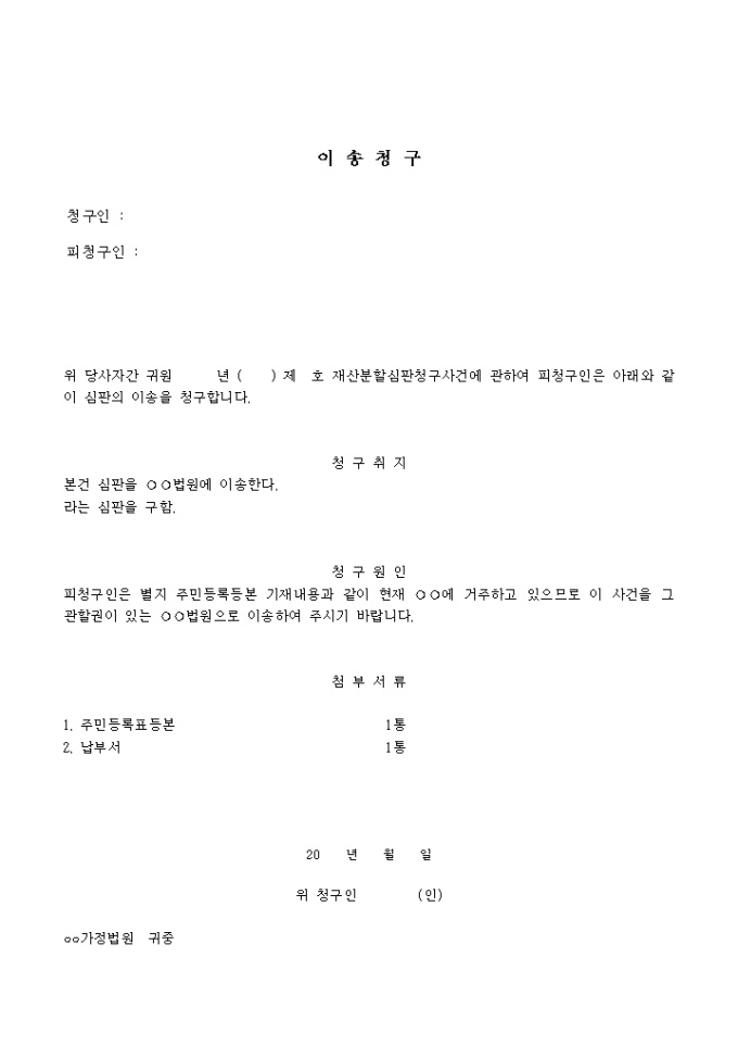9,000원/월재산분할심판청구사건에 관하여 피청구인은 명시한 내용과 같이 심판의 이송을 청구할 때 사용하는 청구서 양식입니다.