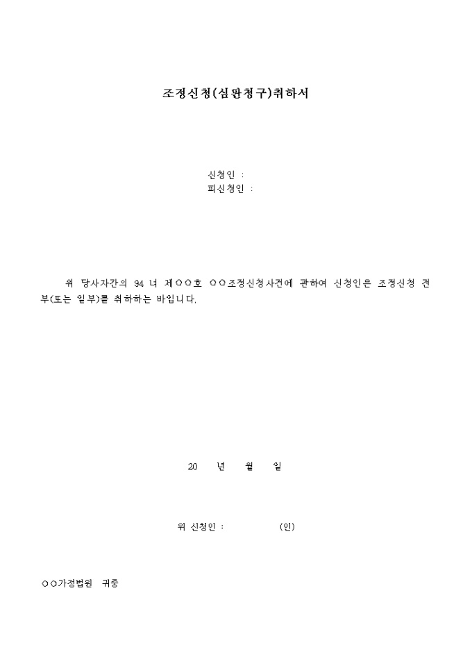 9,000원/월조정신청사건에 관하여 신청인은 조정신청 전부(또는 일부)를 취하함을 나타내는 양식입니다.