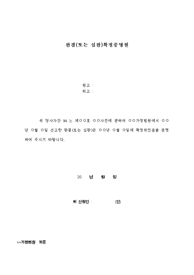 사건에 관하여 가정법원에서 선고한 판결(또는 심판)은 확정되었음을 증명 요청하는 양식입니다.