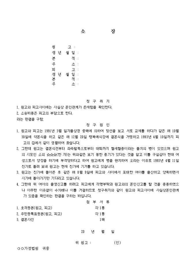 9,000원/월원고와 피고사이에는 사실상 혼인관계가 존재함을 확인할 경우 사용하는 소장 양식입니다.