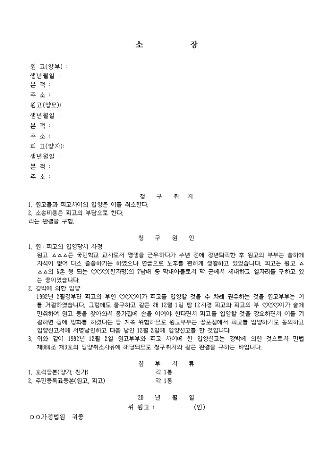 원와 피고사이의 입양의 취소를 요청하는 소장 양식입니다.