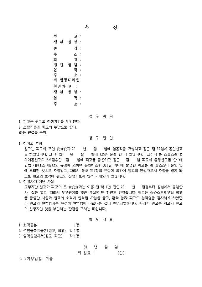 9,000원/월원고(부)가 피고(아들)가 친생자임을 부인할 경우 사용하는 소장 양식입니다.