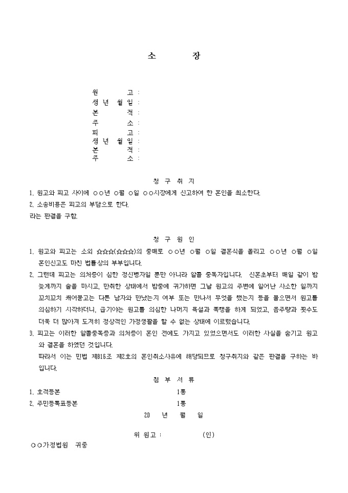 9,000원/월혼인당시에 부부생활을 계속할 수 없는 악질이 있음을 몰랐다는 사유로 제소하는 경우의 소장 양식입니다.