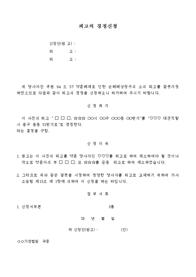 9,000원/월약혼해제로 인한 손해배상청구의 소의 피고를 잘못 지정 하였으므로 기재한 내용과 같이 피고의 경정을 신청하오니 이를 허가요청할 대 사용하는 신청서 양식입니다.