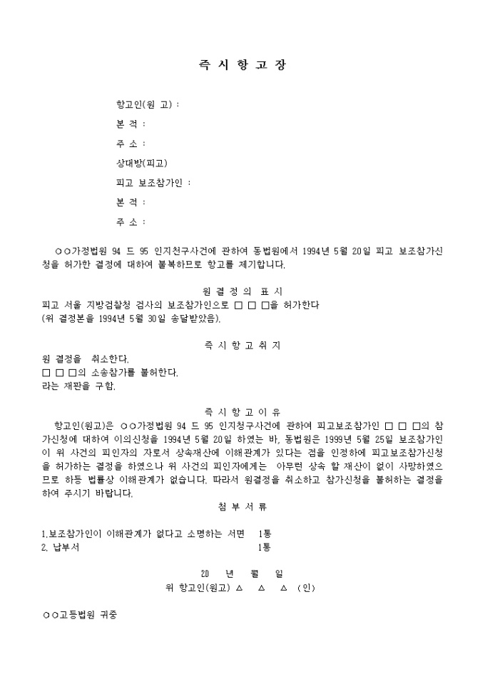 인지천구사건에 관하여 동법원에서 피고 보조참가신청을 허가한 결정에 대하여 불복하므로 항고를 제기할 경우 사용하는 항고장 양식입니다.