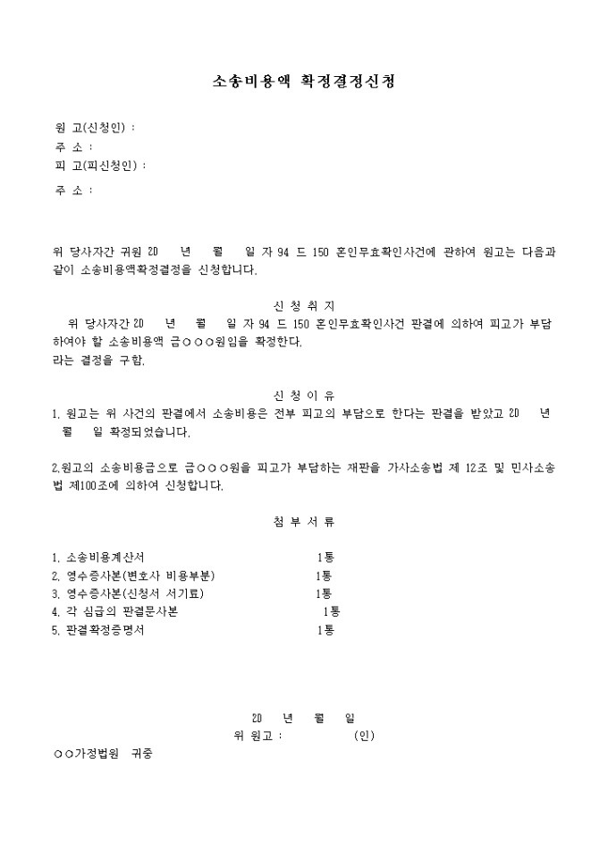 혼인무효확인사건에 관하여 원고는 기재한 내용과 같이 소송비용액확정결정을 신청할 때 사용하는 양식입니다.