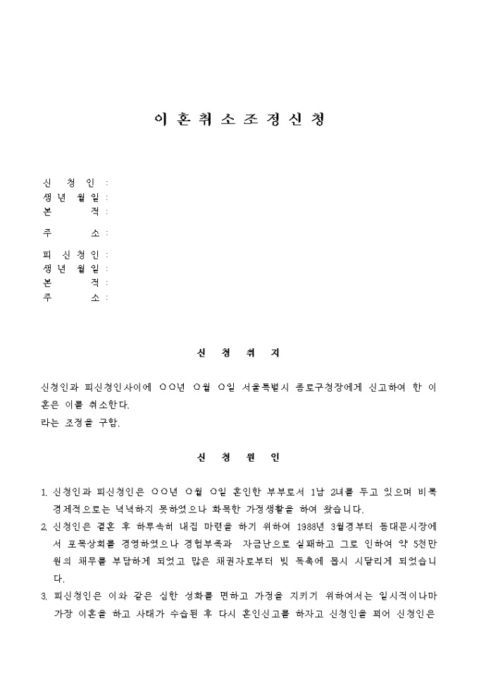 신청인과 피신청인사 이에 구청장에게 신고하여 한 이혼를 취소함에 대한 조정을 신청할 때 사용하는 양식입니다.