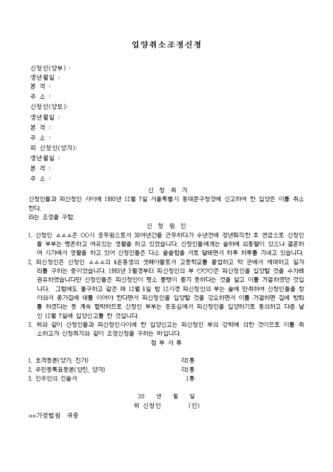 9,000원/월신청인들과 피신청인 사 이에 구청장에 신고하여 한 입양에 대한 취소 내용의 조정을 신청할 때 사용하는 양식입니다.