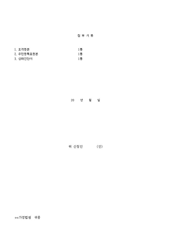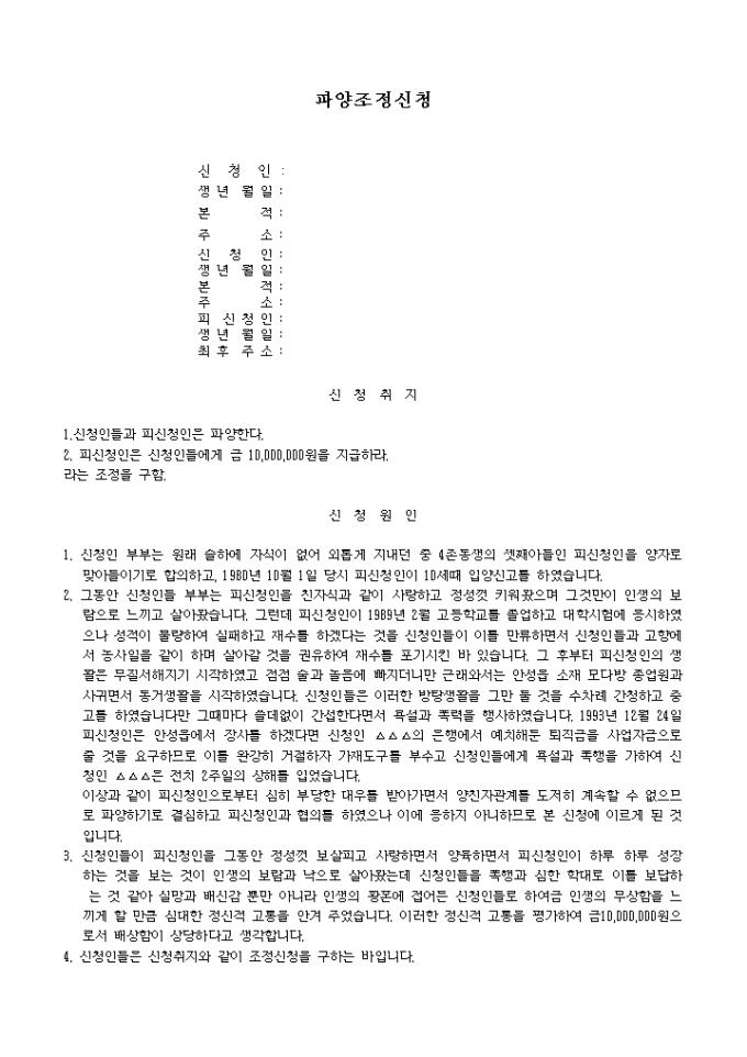 위자료 청구와 병합신청하는 경우 사용하는 파양조정 신청서 양식입니다.