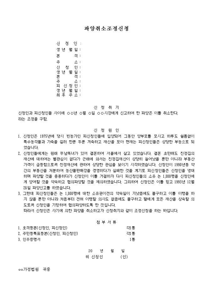 9,000원/월파양전 조건을 제대로 이행하지 않는 사기에 의한 파양을 취소하고자 할 때 사용하는 조정신청서 양식입니다.