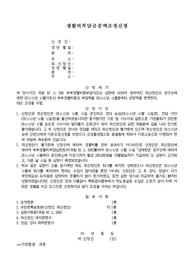 부부생활비용부담사건의 심판에 의하여 정하여 진 피신청인의 청구인에 대한 부부생활비용의 부담액을 일정시일로부터 상당액을 증액함에 대한 조정을 구할 때 사용하는 양식입니다.
