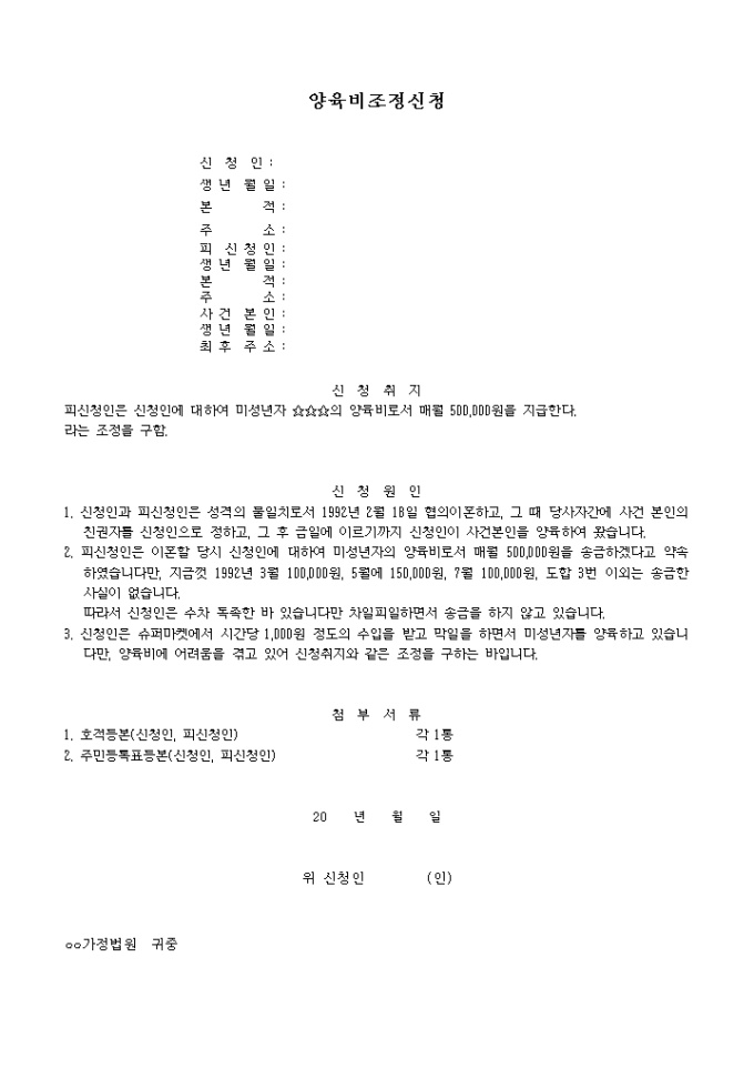 9,000원/월피신청인은 신청인에 대하여 미성년자의 양육비로서 매월 일정금액을 지급할것에 대한 조정을 구할 때 사용하는 양식입니다.