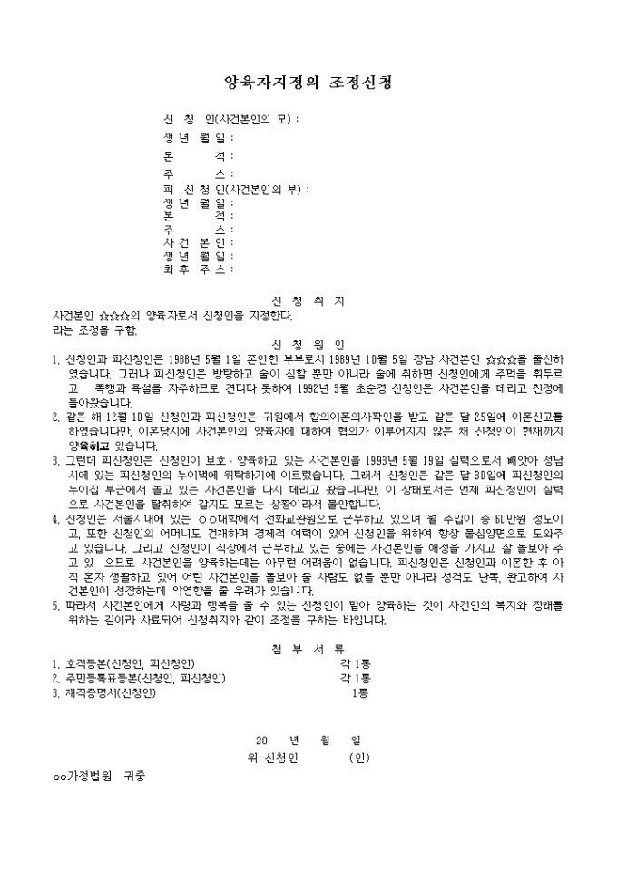 9,000원/월부모가 이혼한 경우 양육자로서 신청인을 지정함에 대한 조정을 구할 때 사용하는 양식입니다.