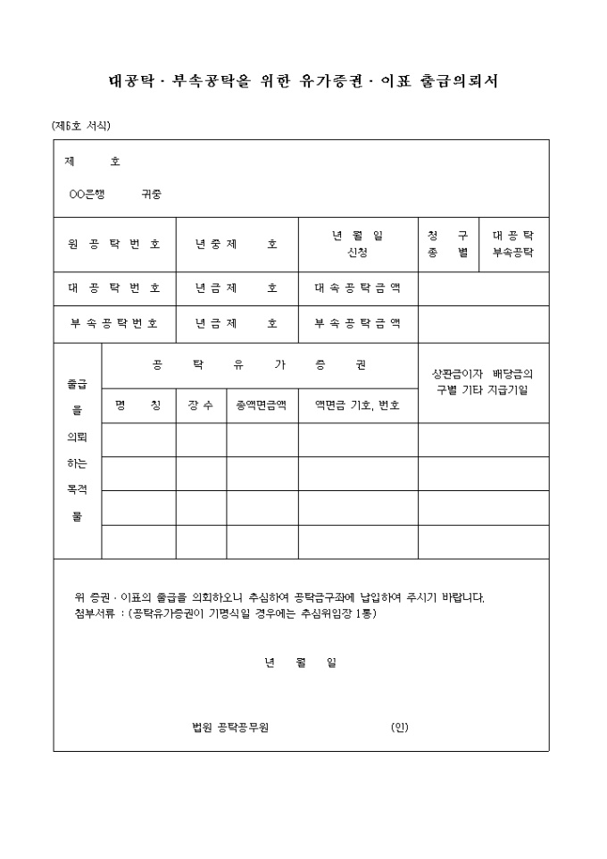 (제6호 서식) 대공탁을 위한 유가증권출급의뢰서 양식입니다. 위 증권·이표의 출급을 의회하오니 추심하여 공탁금구좌에 납입하여 주시기 바랍니다. 첨부서류 : (공탁유가증권이 기명식일 경우에는 추심위임장 1통) ...