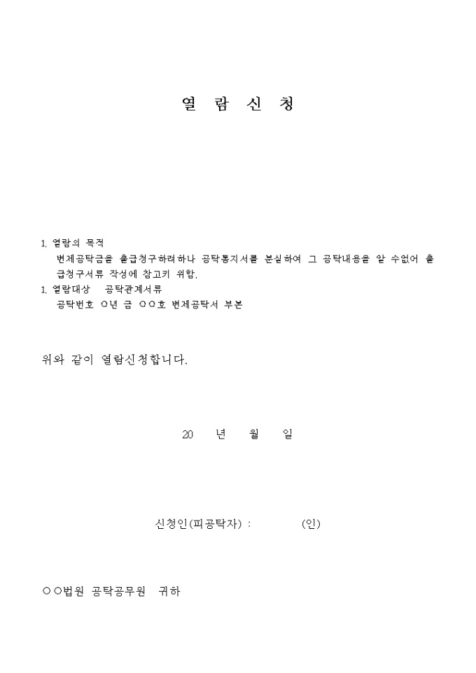 열람신청서 입니다. 1. 열람의 목적 변제공탁금을 출급청구하려하나 공탁통지서를 분실하여 그 공탁내용을 알 수없어 출급청구서류 작성에 참고키 위함. 1. 열람대상 공탁관계서류 공탁번호 년 금 호 변제공탁서 부본 ...