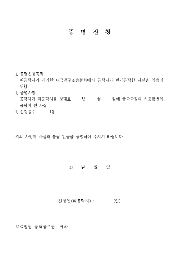 증명신청서 입니다. 1. 증명신청목적 피공탁자가 제기한 대금청구소송절차에서 공탁자가 변제공탁한 사실을 입증키위함. 1. 증명사항 공탁자가 피공탁자를 상대로 년 월 일에 금 원의 차용금변제 공탁이 된 사실 1. 신청통수 1통 ...
