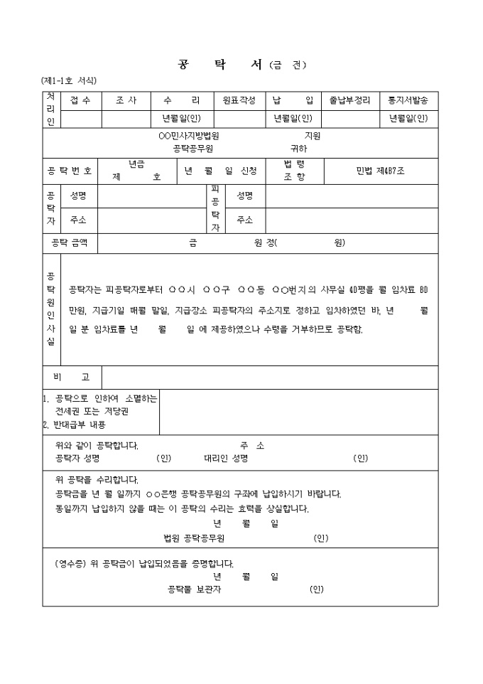 (제1-1호 서식) 1개월분임료의공탁서 양식입니다. 공탁자는 피공탁자로부터 시 구 동 O번지의 사무실 40평을 월 임차료 80만원, 지급기일 매월 말일, 지급장소 피공탁자의 주소지로 정하고 임차하였던 바, 년 월 일 분 임차료를 년 월 일 에 제공하였으나 수령을 거부하므로 공탁함. ...
