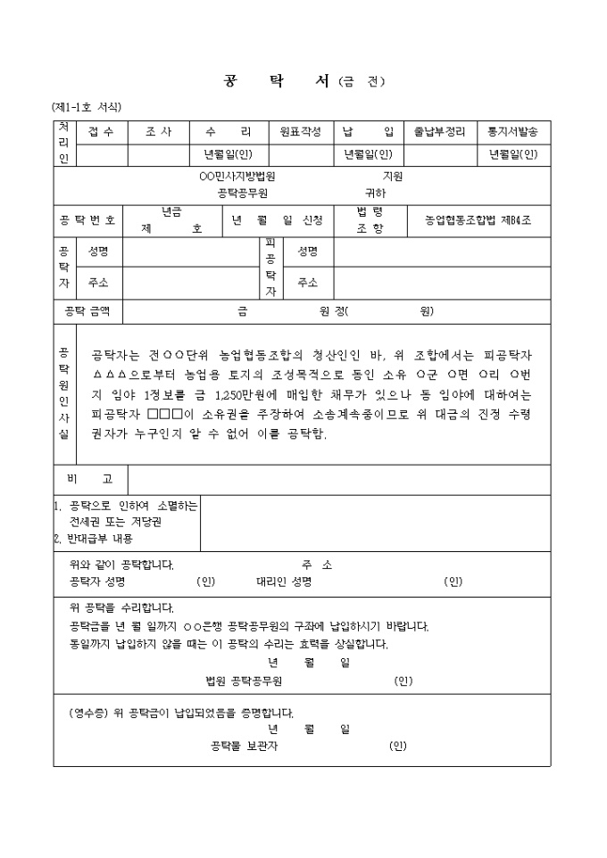 (제1-1호 서식) 농업협동조합청산인의잔여재산분배를 위한 공탁서 양식입니다. 공탁자는 전○○단위 농업협동조합의 청산인인 바, 위 조합에서 는 피공탁자 △△△으로 부터 농업용 토지의 조성목적으로 동인 소유 ○군 ○면 ○리 ○번지 임야 1정보를 금 1, 250만원에 매입한 채무가 있으나 동 임야에 대하여 는 피공탁자 □□□이 소유권을 주장하여 소송계속중이므로 위 대금의 진정 수령권자가 누구인지 알 수 없어 이를 공탁함. ...