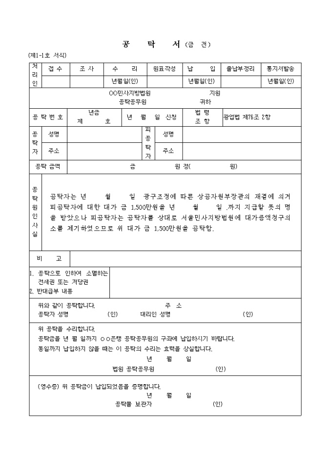 공탁자는 년 월 일 광구조정에 따른 상공자원부장관의 재결에 의거 피공탁자에 대한 대가 금 1,500만원을 년 월 일 .까지 지급할 뜻의 명을 받았으나 피공탁자는 공탁자를 상대로 서울민사지방법원에 대가증액청구의 소를 제기하였으므로 위 대가 금 1,500만원을 공탁함.