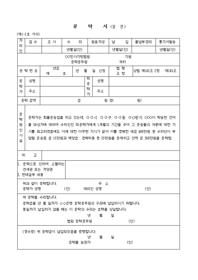 공탁자는 화물운송업을 하고 있는데, 시 구 동 O번지 OOO이 탁송한 건어물 50상자에 대하여 수하인인 피공탁자에게 1개월의 기간을 주어 그 운송물의 처분에 대한 지시를 최고하였음에도 이에 대한 아무런 지시가 없어 이를 경매한 대금 400만원 중 수하인이 부담할 운송료 금 15만원과 체당금ㆍ경매비용 등 25반원을 공제하고 잔액 금 360만원을 공탁함.