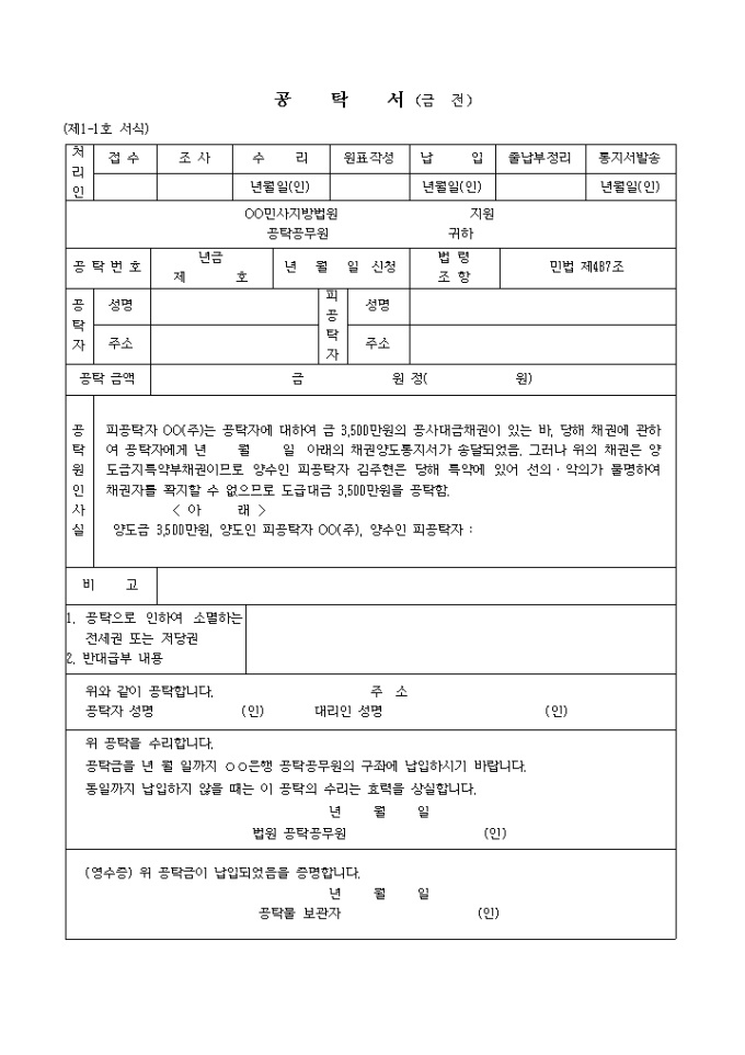피공탁자 OO(주)는 공탁자에 대하여 금 3,500만원의 공사대금채권이 있는 바, 당해 채권에 관하여 공탁자에게 년 월 일 아래의 채권양도통지서가 송달되었음. 그러나 위의 채권은 양도금지특약부채권이므로 양수인 피공탁자 김주현은 당해 특약에 있어 선의ㆍ악의가 불명하여 채권자를 확지할 수 없으므로 도급대금 3,500만원을 공탁함.