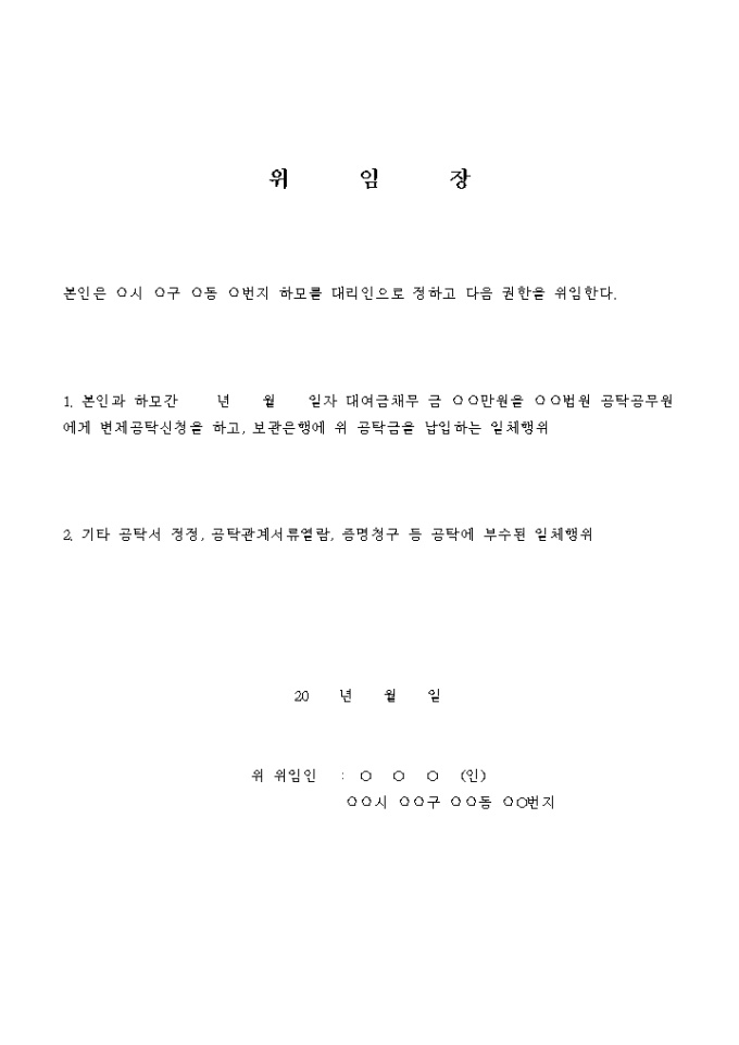 9,000원/월위임장(공탁신청행위및공탁물납입행위일경우) 입니다. 1. 본인과 하모간 년 월 일자 대여금채무 금 ○○만원을 ○○법원 공탁공무원에게 변제공탁신청을 하고, 보관은행에 위공탁금을 납입하는 일체행위 ..
