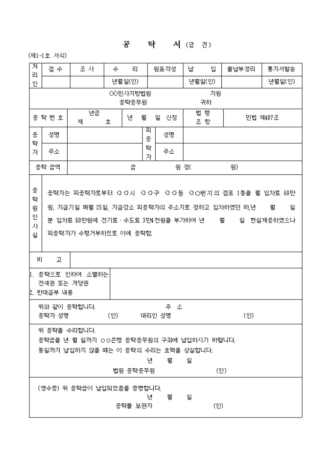 (제1-1호 서식) 임료에전기료수도료등을부가한공탁서 입니다. 공탁자는 피공탁자로부터 시 구 동 O번지의 점포 1동을 월 임차료 60만원, 지급기일 매월 25일, 지급장소 피공탁자의 주소지로 정하고 임차하였던 바, 년 월 일 분 임차료 60만원에 전기료ㆍ수도료 3만4천원을 부가하여 년 월 일 현실제공하였으나 피공탁자가 수령거부하므로 이에 공탁함. ...