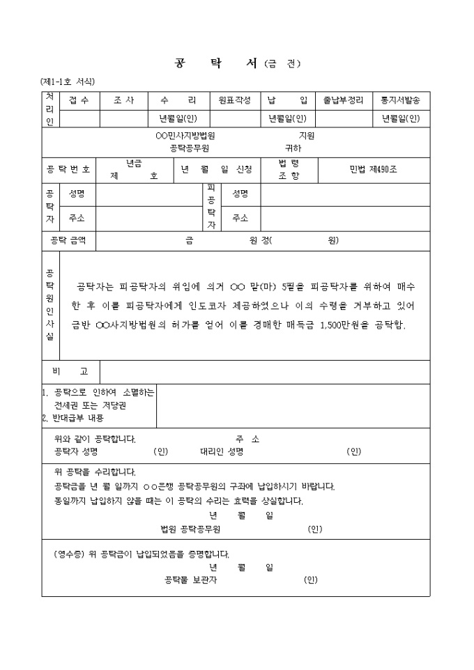 (제1-1호 서식) 자조매각대금의공탁서 입니다. 공탁자는 피공탁자의 위임에 의거 OO 말(마) 5필을 피공탁자를 위하여 매수한 후 이를 피공탁자에게 인도코자 제공하였으나 이의 수령을 거부하고 있어 금반 OO사지방법원의 허가를 얻어 이를 경매한 매득금 1, 500만원을 공탁함. ...