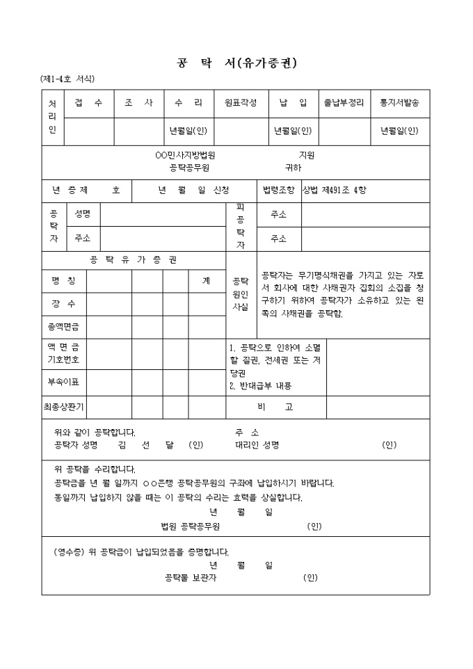 9,000원/월(제1-4호 서식) 상법제491조(사채권자집회의소집청구)의공탁서(사채권의공탁) 입니다. 공탁자는 무기명식채권을 가지고 있는 자로서 회사에 대한 사채권자 집회의 소집을 청구하기 위하여 공탁자가 소유하고 있는 왼쪽의 사채권을 공탁함. ...