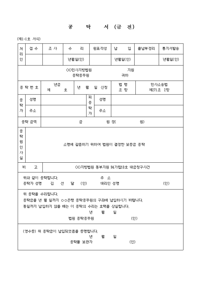 (제1-1호 서식) 소명에갈음하는보증공탁서 입니다. 소명에 갈음하기 위하여 법원이 결정한 보증금 공탁 ...
