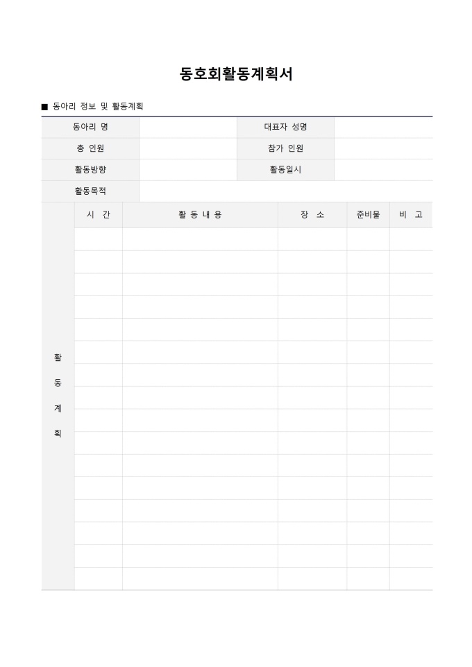 9,000원/월동호회활동계획서 입니다. 동아리 정보 및 활동계획(동아리명, 대표자 성명, 총인원, 참가인원, 활동방향, 활동일시, 활동목적, 활동계획) 등으로 구성되어 있습니다.