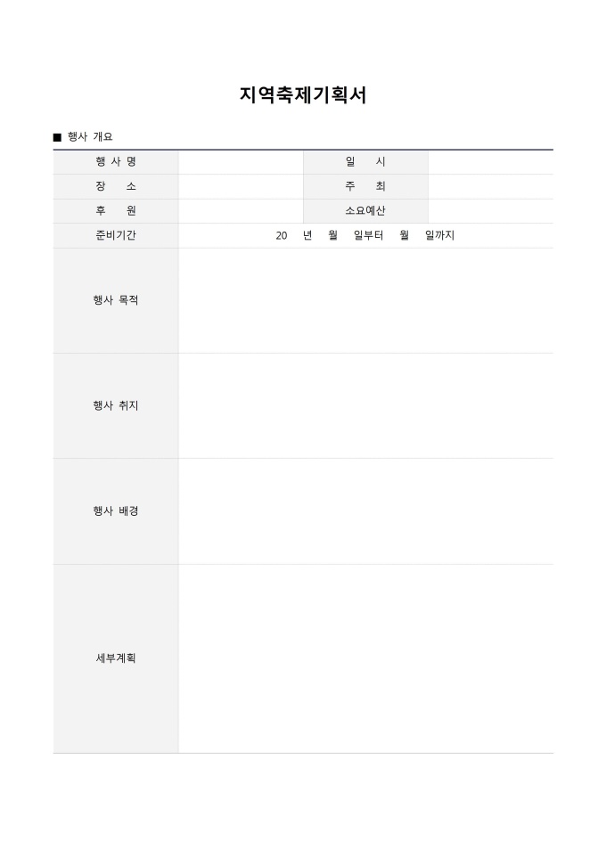 9,000원/월지역축제기획서 입니다. 행사명, 일시, 장소, 주최, 후원, 소요예산, 준비기간, 행사목적, 행사취지, 행사배경, 세부계획 등으로 구성되어 있습니다.
