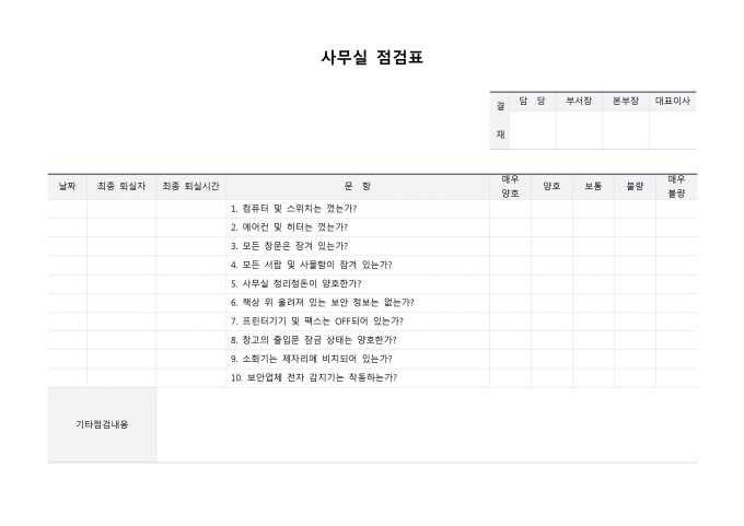 9,000원/월사무실점검표입니다. 날짜, 최종 퇴실자, 최종 퇴실시간, 점검문항 등으로 구성되어 있습니다.