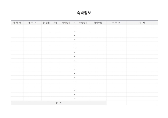 숙박일보입니다. 예약자, 연락처, 총 인원, 호실, 예약 일자 ~ 퇴실 일자, 결제수단, 숙박료 등으로 구성되어 있습니다.