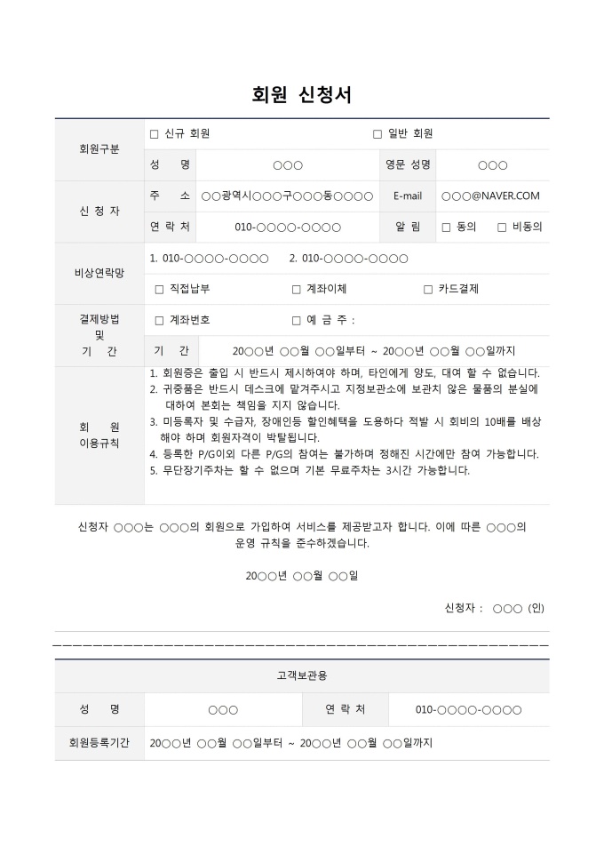 9,000원/월회원신청서입니다. 회원구분, 신청자, 비상연락망, 결제방법 및 기간, 회원이용구칙 등의 항목으로 구성되어있습니다.