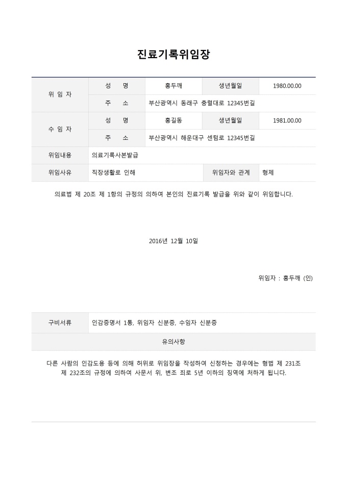 진료기록위임장입니다. 위임자 성명, 생년월일, 주소, 수임자 성명, 생년월일, 주소, 위임내용, 위임사유, 위임자와 관계 구비서류, 유의사항 등의 항목으로 구성되어 있습니다.