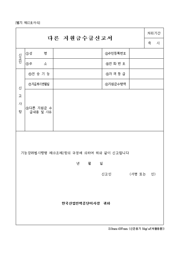 별지 제12호서식으로 기능장려법시행령 제10조제2항의 규정에 의한 다른 지원금수급신고서(2001,11,30)입니다.