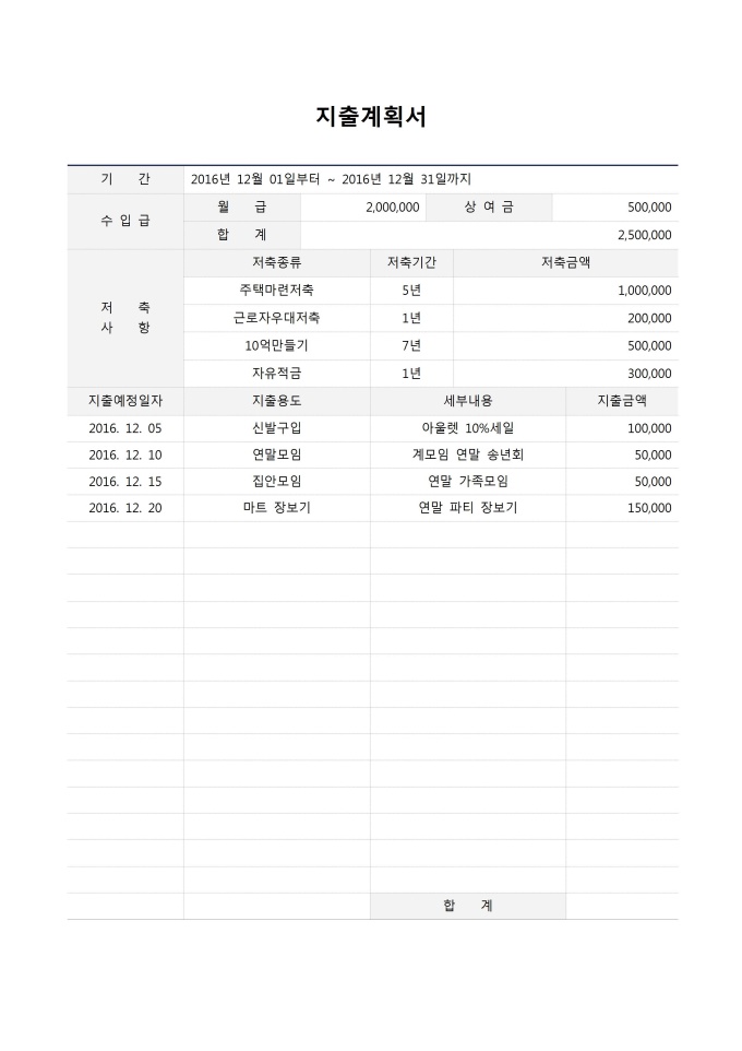 9,000원/월지출계획서입니다. 기간, 수입금, 월급, 상여금, 합계, 저축사항, 저축종류, 저축기간, 저축금액, 지출예정일자, 지출용도, 세부내용, 지츨금액 등의 항목으로 구성되어있습니다.