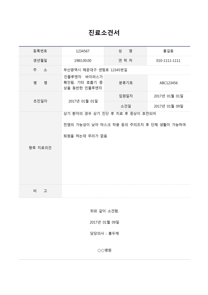 9,000원/월진료소견서입니다. 등록번호, 성명, 생년월일, 연락처, 주소, 병명, 분류기호, 초진일자, 입원일자, 소견일, 향후 치료의견, 비고 등의 항목으로 구성되어있습니다.