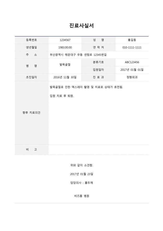 9,000원/월진료사실서입니다. 등록번호, 성명, 생년월일, 연락처, 주소, 병명, 분류기호, 입원일자, 진료과, 초진일자, 향후 치료의견, 비고 등의 항목으로 구성되어있습니다.