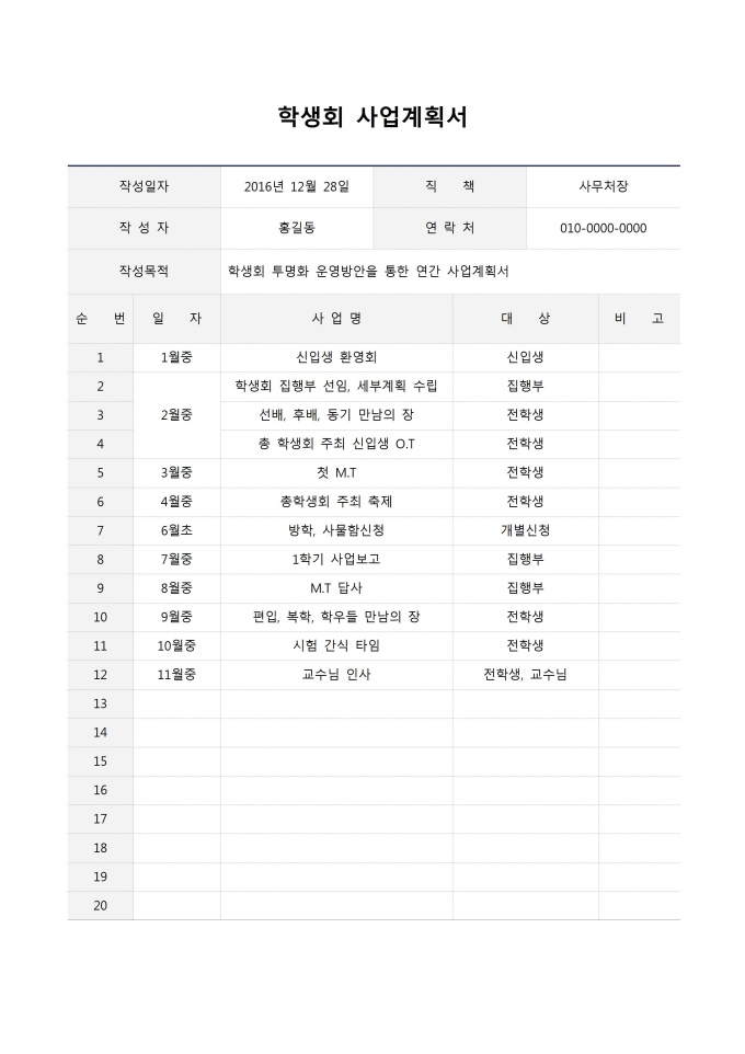 학생회사업계획서입니다. 작성일자, 직책, 작성자, 연락처, 작성목적, 순번, 일자, 사업명, 대상, 비고 등의 항목으로 구성되어있습니다.