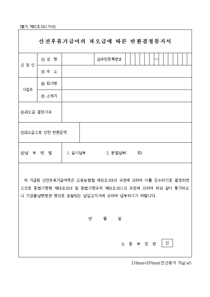 9,000원/월별지 제62호의11서식으로 지급된 산전후휴가급여액은 고용보험법 제55조의9의 규정에 의하여 이를 징수하기로 결정하였으므로 동법시행령 제68조의10 및 동법시행규칙 제66조의11의 규정에 의해 기금출납명령관 명의로 송달되는 납입고지서에 의하여 납부하라는 내용입니다.