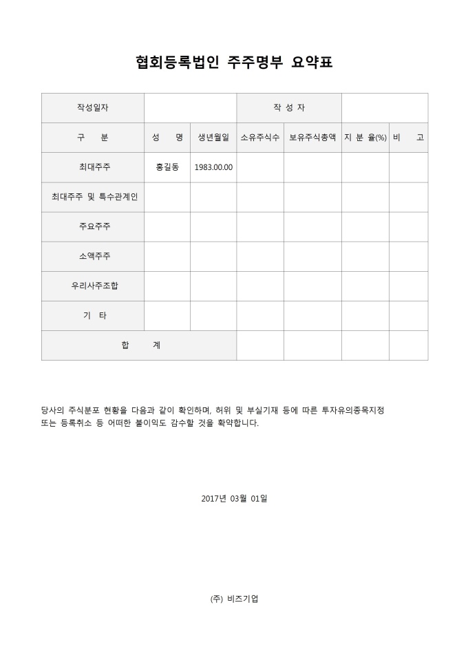 9,000원/월협회등록법인 주주명부 요약표입니다. 작성일자, 작성자, 구분, 성명, 생년월일, 소유주식수, 보유주식 총액, 지분율(%), 비고 등의 항목으로 구성되어있습니다.