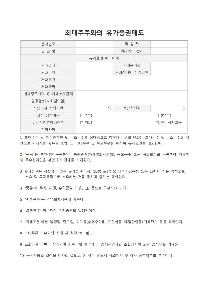 최대주주와의 유가증권매도 입니다. 문서번호, 작성자, 법인명, 회사와의 관계, 유가증권 매도내역, 거래일자, 거래목적물, 거래금액, 거래조건, 거래목, 최대주주와의 총 거래누계금액, 결정일, 사외이사 참석인원, 감사 착석여부, 공정거래법해당여부, 기타사항 등의 항목으로 구성되어있습니다.