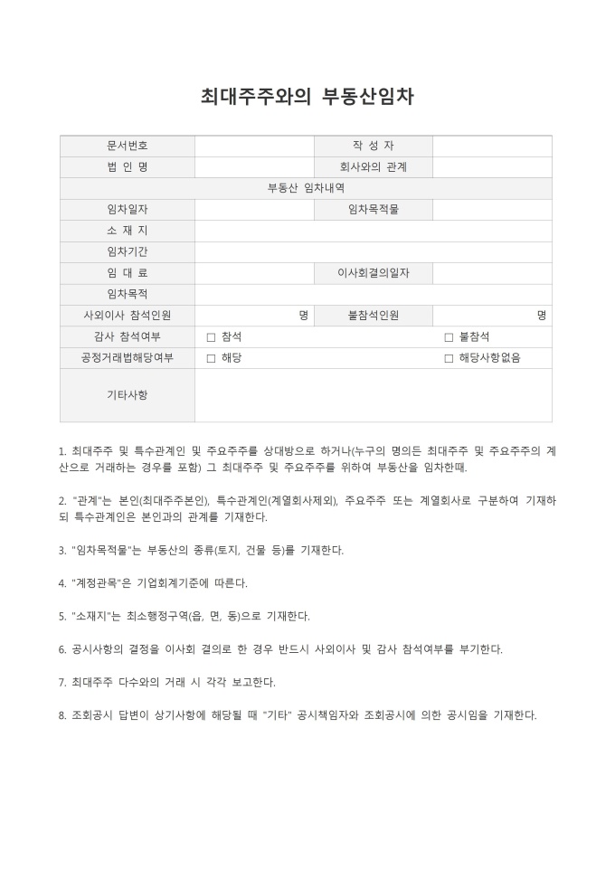 최대주주와의 부동산임차입니다. 문서번호, 작성자, 법인명, 회사와의 관계, 부동산 임차내역, 임차일자, 임차목적물, 소재지, 임차기간, 임대료, 이사회결의일자, 임자목적, 사외이사 참석인원, 불참석인원, 감사참석여부, 공정거래법해당여부, 기타사항 등의 항목으로 구성되어있습니다.