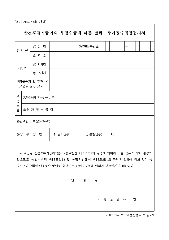 9,000원/월별지 제62호의10서식으로 지급된 산전후휴가급여액은 고용보험법 제55조의9의 규정에 의하여 이를 징수하기로 결정하였으므로 동법시행령 제68조의10 및 동법시행규칙 제66조의11의 규정에 의하여 통지하오니 기금출납명령관 명의로 송달되는 납입고지서에 의하여 납부를 당부하는 내용입니다.