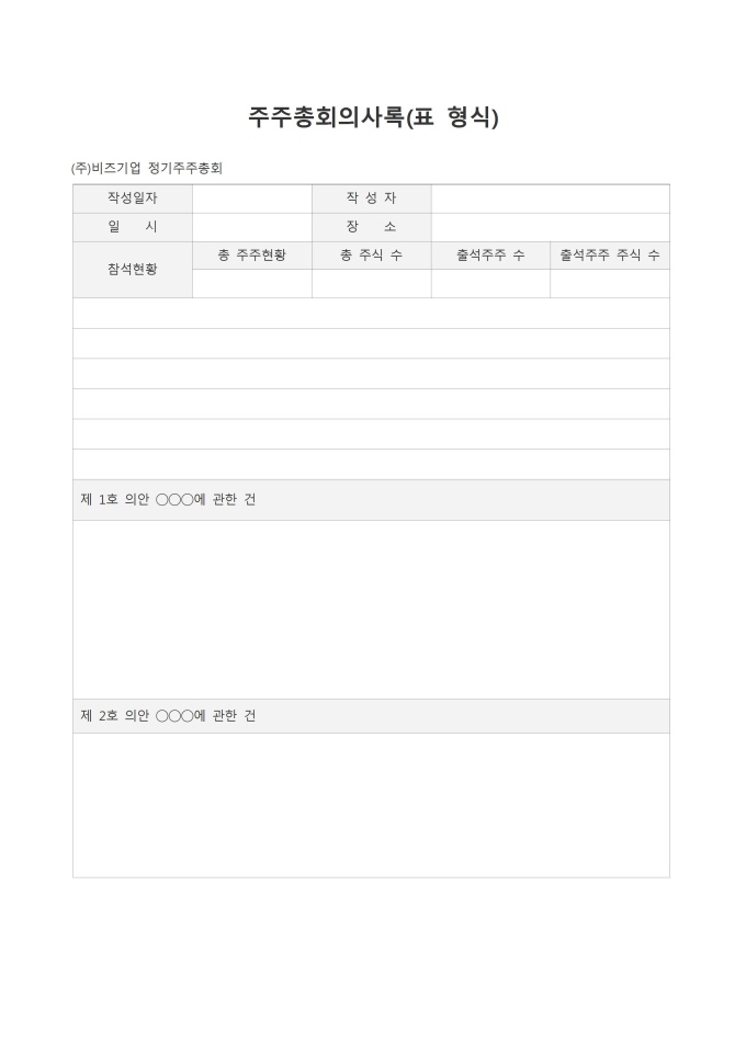 주주총회의사록입니다.표형식으로 되어있으며 작성일자, 작성자, 일시, 장소, 참석현황, 총 주주현황, 총 주식수, 출석주주수 출석주주 주식수 제 1호의안, 제 2호의안 등의 항목으로 구성되어있습니다.
